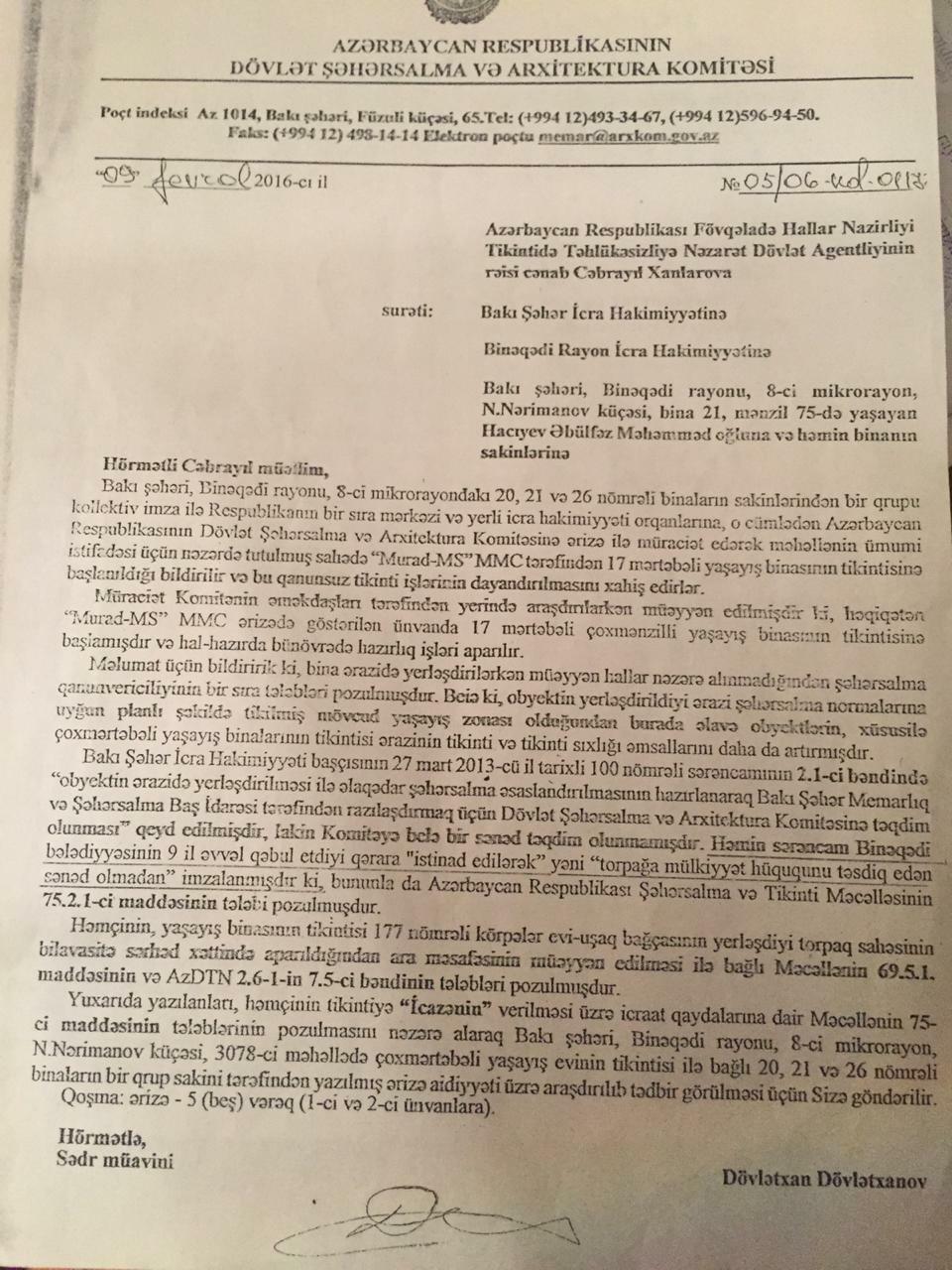 “Bu bina şirkətin hazırda əlində olan layihələndirmə sənədi və 032 nömrəli “Xüsusi Nişan” ilə tikilir. Dövlət Şəhərsalma və Arxitektura Komitəsinin sədr müavini Dövlətxan Dövlətxanov da mənimlə söhbətində təsdiqlədi ki, Murad M.C MMC-yə yaşayış binasında tikinti işlərinə başlanılması üçün əsas olan 6 dekabr 2013-cü il tarixli 032 nömrəli “Xüsusi Nişan” Bakı Şəhər İcra Hakimiyyəti başçısının 27 mart 2013-cü il tarixli 100 nömrəli sərəncamı ilə verilib. Ancaq D.Dövlətxanov özü də deyir ki, tikintiyə icazə sərəncamı olmadan “Xüsusi Nişan”ın verilməsi mümkün deyil”.
