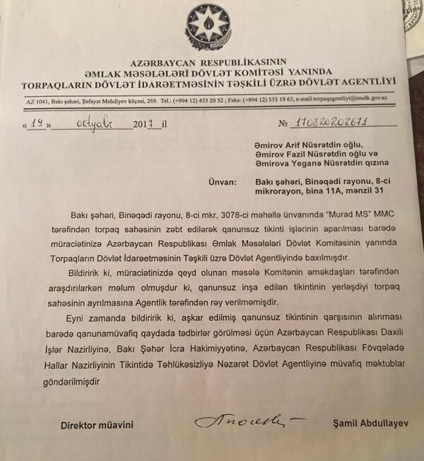 “Lakin bu şəxslərin əlində layihələndirmə sənədindən başqa heç nə yoxdur. Mən bununla əlaqədar Əmlak Məsələləri Dövlət Komitəsi yanında Torpaqların Dövlət İdarəetməsinin Təşkili üzrə Dövlət Agentliyinə rəsmi müraciət etdim. Müraciətim əsasında qanunsuz olaraq həyata keçirilən tikintidə araşdırma aparıldı. Araşdırmadan sonra mənə 2017-ci il 19 oktyabr tarixində agentliyin direktor müavini Şamil Abdullayevin imzası ilə rəsmi cavab gəldi. Cavabda bunlar yazılmışdı: “Komitənin əməkdaşları tərəfindən araşdırılarkən məlum olub ki, qanunsuz inşa edilən tikintinin yerləşdiyi torpaq sahəsinin ayrılmasına agentlik tərəfindən rəy verilməyib. Aşkar edilmiş qanunsuz tikintinin qarşısının alınması barədə qanunamüvafiq qaydada tədbirlər görülməsi üçün Daxili İşlər Nazirliyinə, Bakı Şəhər İcra Hakimiyyətinə müvafiq məktublar göndərilib”. Yəni fakt odur ki, bu şirkətin əlində tikintiyə icazə ilə bağlı heç bir sənəd yoxdur”.