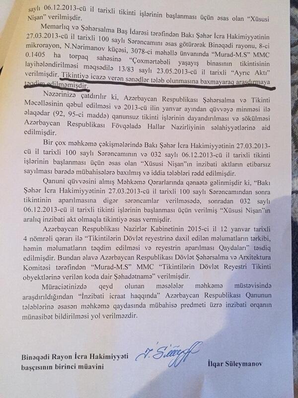 “Binəqədi Rayon İcra Hakimiyyəti başçısının birinci müavini İlqar Süleymanovun imzası ilə olan rəsmi cavabda da qeyd edilib ki, Memarlıq və Şəhərsalma Baş İdarəsi tərəfindən Bakı Şəhər İcra Hakimiyyətinin 27.03.2013 tarixli 100 saylı sərəncamını əsas götürərək qeyd olunan ünvanda MMC tərəfindən 0.1405 ha torpaq sahəsinə çoxmərtəbəli yaşayış binasının tikintisinin layihələndirilməsi məqsədilə 13/83 saylı 23.05.2013-cü il tarixli “Ayrıc Aktı” verilib. Lakin araşdırma zamanı şirkət rəhbərliyindən tikintiyə icazə verən sənədlər tələb olunsa da, bu sənədlər təqdim edilməyib. Təqdim edilməməsinin səbəbi də budur ki, belə bir sənəd ümumiyyətlə yoxdur.