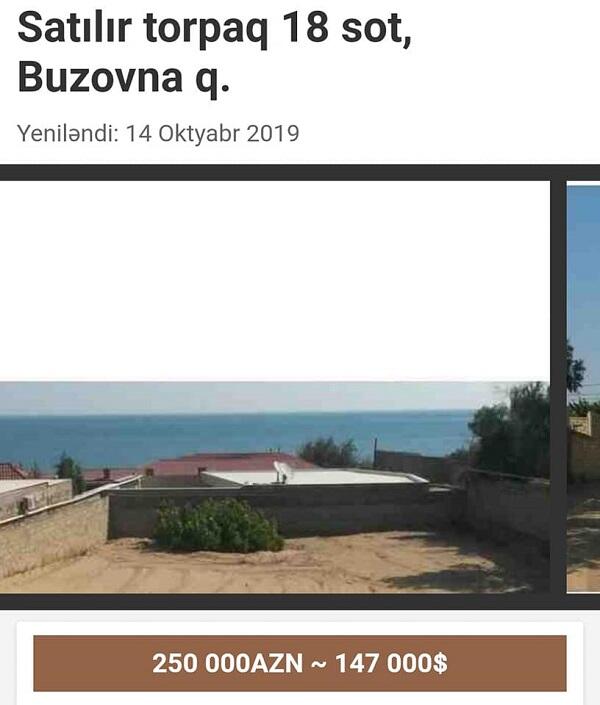Sabir Hacıyevin oğlu eyni vaxtda Buzovnada dəniz kənarındakı 18 sot torpaq sahəsini də 250 min manata satışa təqdim edib. Daşınmaz əmlak saytlarında müvafiq elan təcili qrifi ilə yerləşdirilib.