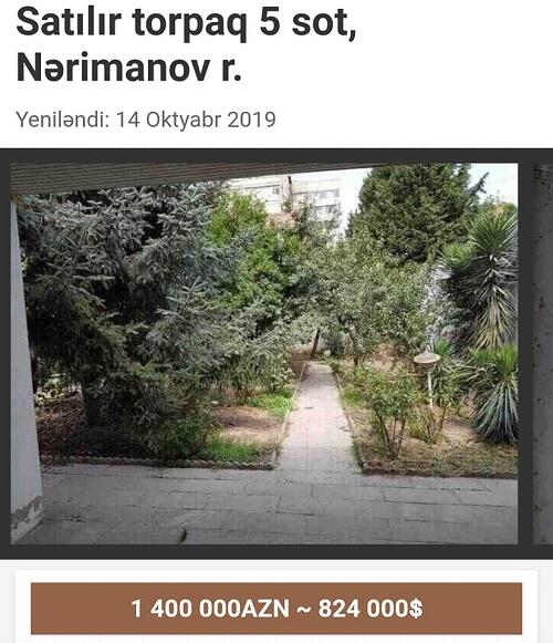 Jurnalistin sözlərinə görə, millət vəkili torpaq sahəsinə 1,4 milyon manat qiymət qoyub. Ərazi deputatın böyük oğlu Samir Hacıyev tərəfindən keçən ayın ortalarında əmlakçılara təqdim olunub.