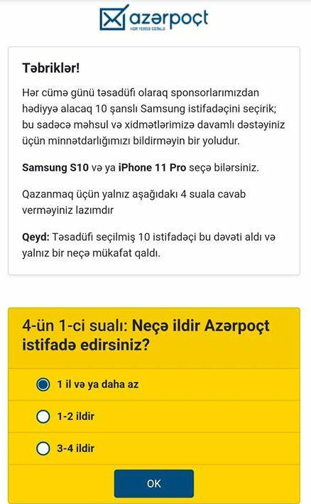 Qeyd edək ki, sosial şəbəkələrdə vətəndaşlar onların elektron poçt ünvanlarına “Azərpoçt” adından “4 suala cavab ver, hədiyyə qazan” məzmununda mesajlar gəldiyini yazıblar.