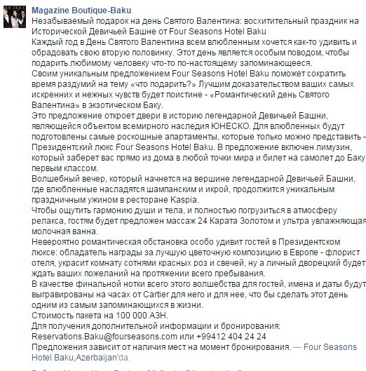 Axar.az-ın xəbərinə görə, hotelin təklifləri sırasında