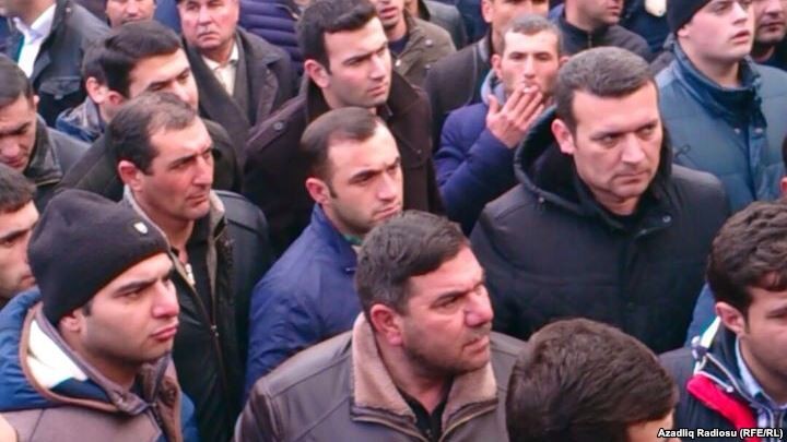 Aksiya iştirakçıları rayon polis şöbəsinin qarşısına toplaşıb.