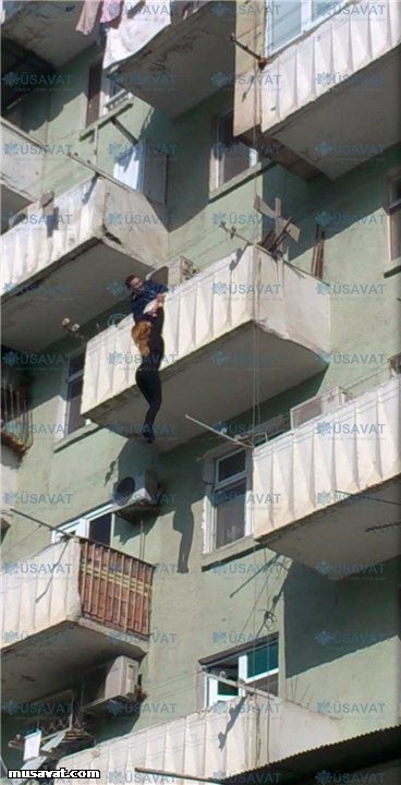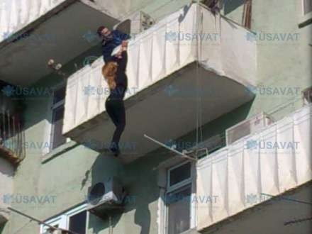 Ətrafda olanlardan biri qadının eyvandan sallanma və aşağı düşmə