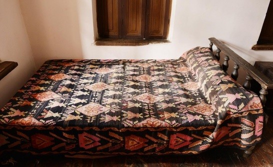 doğulduğu otaqda köhnə örtüklü taxta yataq, balaca masa, güzgü,