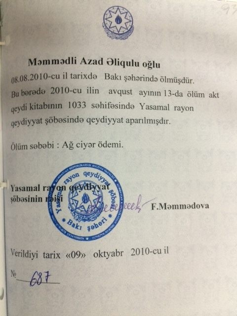 Azad Məmmədlinin öldüyünü təsdiqləyən sənəd təqdim ediblər. Biz də