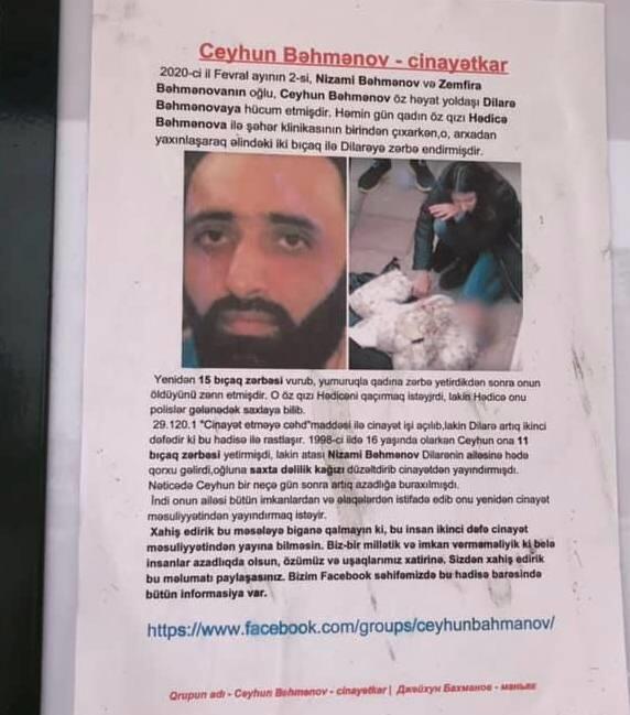 Şuşa Şəhər İcra Hakimiyyətinin sabiq başçısı Nizami Bəhmənovun oğlu Ceyhun Bəhmənovun və ölümcül yaraladığı keçmiş həyat yoldaşının şəkilləri avtobus dayanacaqlarına vurulub.