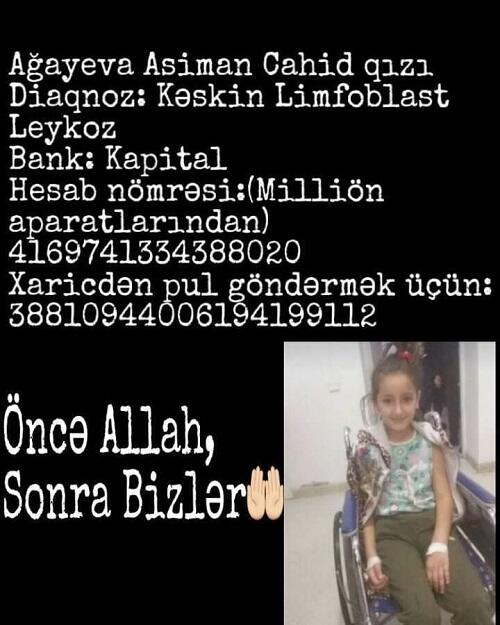 Kəskin leykoz diaqnozu qoyulan 9 yaşlı Asiman Ağayevanın ailəsinin maddi imkanı çatmadığı üçün müalicəni dayandırmaq məcburiyyətindədirlər.