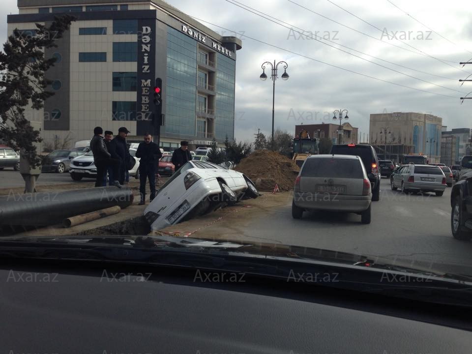 Axar.az xəbər verir ki, prospektdə kanalizasiya borularının yenilənməsi ilə əlaqədar əsas magistral yolun bir hissəsi qazılıb. Yolda hərəkət edən avtomobillərdən biri isə qazılan quyuya düşüb. Sol hissəsi tamamilə quyuya düşən avtomobil uzun müddət həmin formada qalıb.