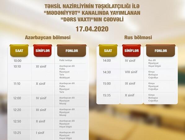 “Mədəniyyət” və "ARB Günəş" kanallarında yayımlanan “Dərs vaxtı” verilişinin aprelin 17-si üçün nəzərdə tutulan cədvəli məlum olub.