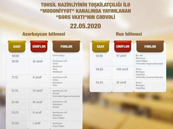 “Mədəniyyət” və "ARB Günəş" kanallarında yayımlanan “Dərs vaxtı” verilişinin mayın 22-i üçün nəzərdə tutulan cədvəli açıqlanıb.