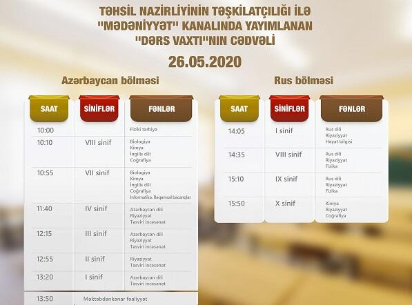 "Mədəniyyət" və "ARB Günəş" kanallarında yayımlanan "Dərs vaxtı" verilişinin mayın 26-sı üçün nəzərdə tutulan cədvəli açıqlanıb.