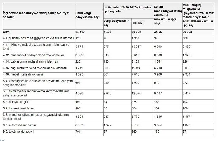 Qurum həmin fəaliyyət sahələri, orada çalışan vergi ödəyiciləri, onların işçi sayı və tətbiq edilən məhdudiyyətlərlə bağlı məlumatları açıqlayıb.