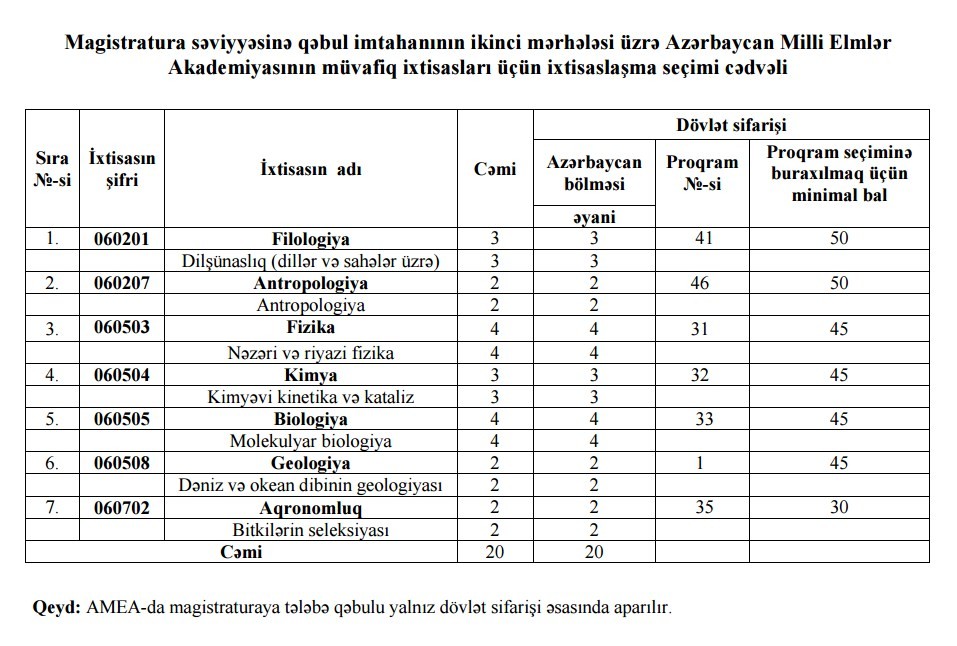 AMEA-dan Axar.az-a verilən məlumata görə, Tələbə Qəbulu üzrə Dövlət Komissiyasının keçirəcəyi magistratura səviyyəsinin ikinci mərhələsinə qəbul olunmaq üçün AMEA üzrə ixtisaslaşma seçimi və ixtisaslaşmalar üzrə qəbul proqramları müəyyən edilib.