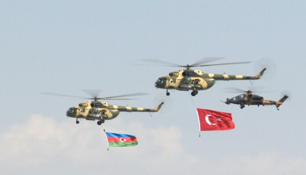 Helikopterlərin keçidi ilə Azərbaycan və Türkiyə respublikalarının dövlət bayraqları nümayiş etdirilib. Bu zəfər bayramında ümummilli liderimiz Heydər Əliyevin “Bir millət, iki dövlət” dahi kəlamının fəlsəfəsi Azərbaycan-Türkiyə qardaşlığının sarsılmaz və əbədi olduğunu göstərir.