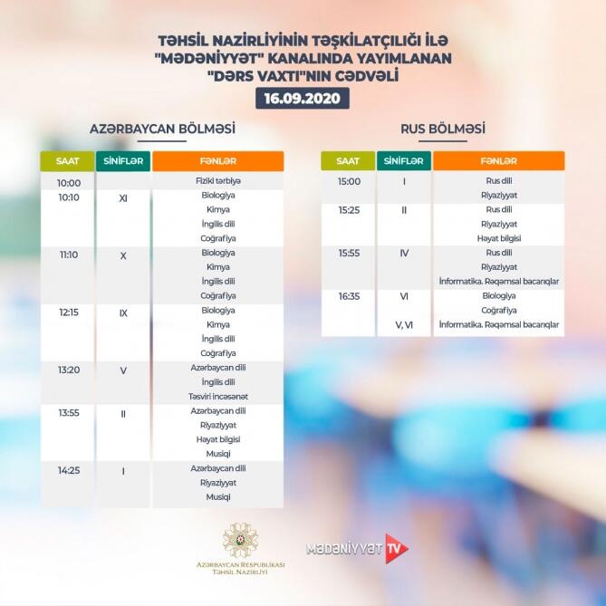“Mədəniyyət”, “ARB Günəş” telekanalları və “Təhsil” televiziyasının “Facebook” səhifəsində yayımlanan “Dərs vaxtı” proqramının sentyabrın 16-sı üçün nəzərdə tutulan cədvəli açıqlanıb.