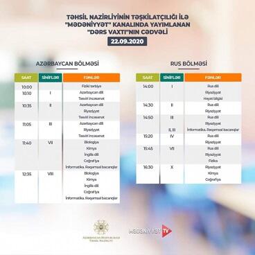 “Mədəniyyət”, “ARB Günəş” telekanalları və “Təhsil” televiziyasının “Facebook” səhifəsində yayımlanan “Dərs vaxtı” proqramının sentyabrın 22-si üçün nəzərdə tutulan cədvəli açıqlanıb.