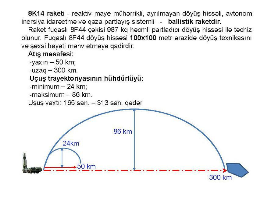Xüsusi vurğulanıb ki, 8K14 raketi reaktiv maye mühərrikli, ayrılmayan döyüş hissəli, avtonom idarəetmə və qəza partlayış sistemli ballistik raketdir. Raket fuqaslı 987 kiloqram həcmli partladıcı döyüş hissəsi ilə təchiz olunub. Həmin döyüş hissəsi bir hektara qədər ərazidə döyüş texnikasını və şəxsi heyəti məhv etməyə qadirdir. Uçuş trayektoriyasının hündürlüyü uzaq məsafəyə atılanda 86 kilometr, yaxın məsafəyə atış zamanı isə 24 kilometrdir. Uçuş vaxtı 165-313 saniyədir.