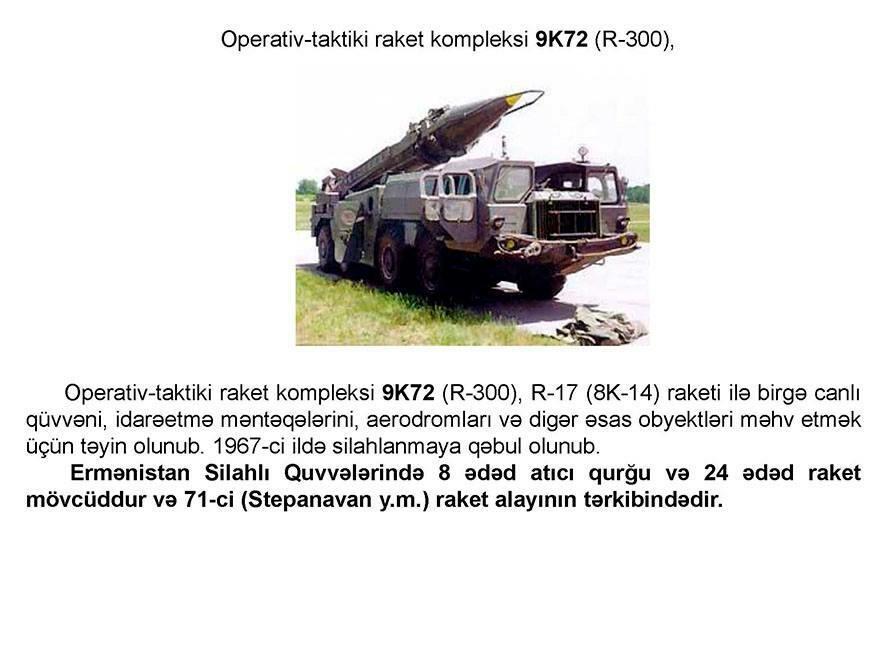 Axar.az xəbər verir ki, brinfinqdə çıxış edən general-mayor İ.Əliyev 9K72 operativ-taktiki raket kompleksinin (OTZK) 8K14 raketi ilə birgə canlı qüvvəni, idarəetmə məntəqələrini, aerodromları və digər əsas obyektləri məhv etmək üçün təyin olunduğunu bildirib. Qeyd edib ki, bu kompleks silahlanmaya 1967-ci ildə qəbul edilib. Raketin atəş məsafəsi 50-300 kilometr, maksimal uzaqlığa uçma vaxtı 5 dəqiqə, start çəkisi 5862 kiloqram, doldurulmamış raketin çəkisi isə 2076 kiloqramdır. Uzunluğu 11 metr 164 santimetrdir. Korpusunun diametri 881 metrdir. Kompleksin ümumi çəkisi 37 ton, döyüş heyəti 8 nəfərdən ibarətdir.