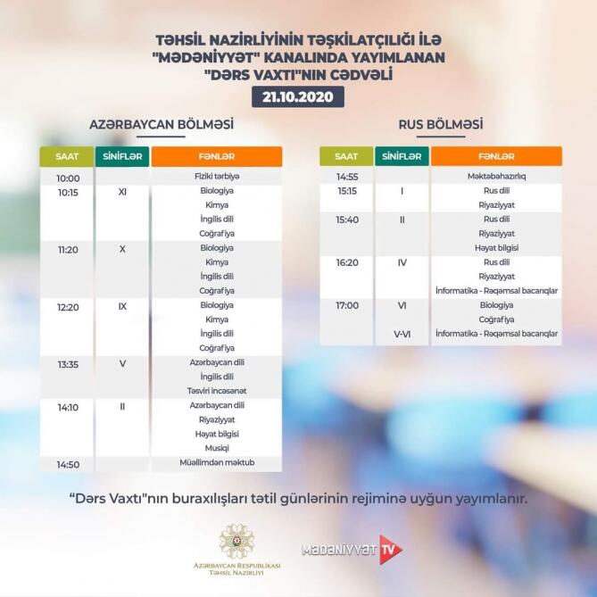 “Mədəniyyət”, “ARB Günəş” telekanalları və “Təhsil” televiziyasının Feysbuk səhifəsində yayımlanan “Dərs vaxtı” proqramının oktyabrın 21-i üçün nəzərdə tutulan cədvəli açıqlanıb.