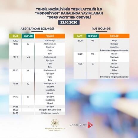“Mədəniyyət”, “ARB Günəş” telekanalları və “Təhsil” televiziyasının Feysbuk səhifəsində yayımlanan “Dərs vaxtı” proqramının oktyabrın 22-si üçün nəzərdə tutulan cədvəli açıqlanıb.