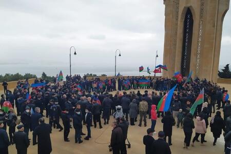 Axar.az Musavat.com-a istinadən xəbər verir ki, vətəndaşlar əllərində Azərbaycan və Türkiyə bayrağı, “Qarabağ Azərbaycandır!” şüarını səsləndirərək, Şəhidlər Xiyabanına yürüş ediblər.
