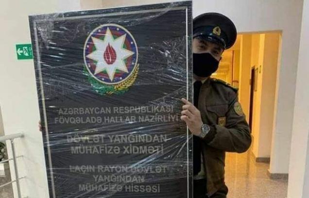 Fövqəladə Hallar Nazirliyinin (FHN) Dövlət Yanğından Mühafizə Xidmətinin Laçın Rayon Dövlət Yanğından Mühafizə Hissəsinin lövhəsi hazırdır.