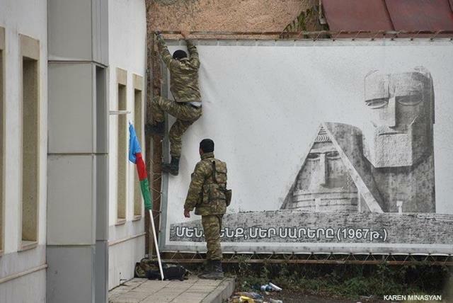 Görüntüdə Azərbaycan hərbçilərinin Laçın şəhərinin küçələrini bayraqla bəzədiyi, şəkil çəkdirdiyi öz əksini tapıb.