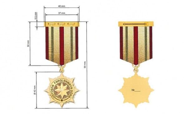 Medal paltara bərkidilmək üçün elementi olan 37 mm x 50 mm ölçülü beşbucaqlı xara lentə iki halqa və ilgək vasitəsilə birləşdirilir. Qızılı rəngli xara lentin mərkəzində 5 mm enində tünd qırmızı rəngli şaquli zolaq təsvir olunmuşdur. Xara lentin sol və sağ kənarlarından mərkəzə doğru, biri digərindən 3 mm aralı, 3 mm enində tünd qırmızı və 2,5 mm enində yaşıl rəngli şaquli zolaqlar vardır. Xara lentin yuxarı hissəsinə üzərində milli ornamentlər təsvir olunmuş 40 mm x 5,5 mm ölçülü lövhə bərkidilmişdir. Medala paltarın yaxasına bərkidilmək üçün elementi olan, eyni xara lentdən üz çəkilmiş 37 mm x 10 mm ölçülü qəlib əlavə olunur.