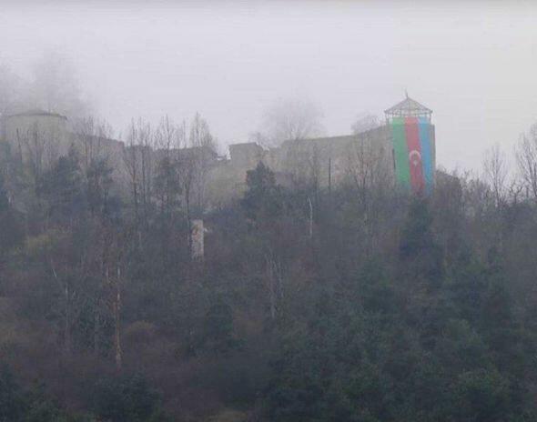 İşğaldan azad olunmuş Şuşa qalasından böyük ölçülü Azərbaycan bayrağı asılıb.