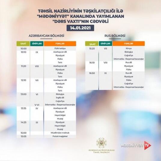“Mədəniyyət”, “ARB Günəş” telekanalları və “Təhsil” televiziyasının Feysbuk səhifəsində yayımlanan “Dərs vaxtı” proqramının yanvarın 14-ü üçün nəzərdə tutulan cədvəli açıqlanıb.