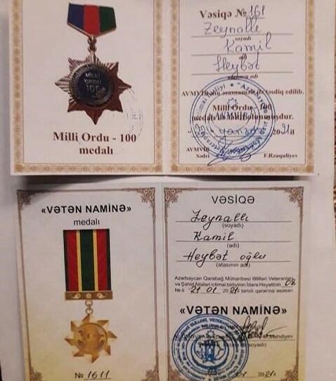 Qeyd edək ki, ötən gün Kamil Zeynallı Feysbuk hesabında Səfərbərlik və Hərbi Xidmətə Çağırış üzrə Dövlət Xidməti tərəfindən "Vətən naminə" və "Milli ordu-100" medalı ilə təltif edildiyini bildirərək, xidmətin rəisi general Arzu Rəhimova və onun 1-ci müavini Mayıl Şahverdiyevə təşəkkür edib.
