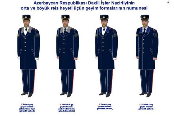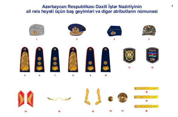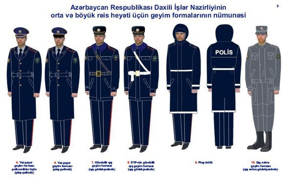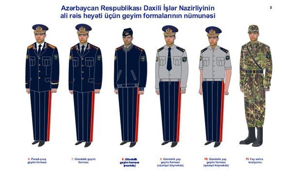 Daxili İşlər Nazirliyinin rəis və sıravi heyətinin geyim formasının və fərqlənmə nişanlarının nümunələrini təqdim edirik.