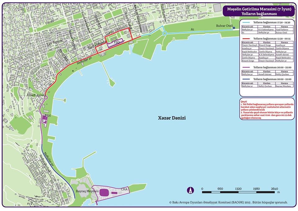 Belə ki, bu tədbirlərlə əlaqədar olaraq, Məşəl Bakıya çatanda, xüsusilə də 7 iyun tarixində bəzi yollarda nəqliyyatın hərəkəti məhdudlaşdırılacaq. NİİM bu tarixdə nəqliyyatın hərəkətinin məhdudlaşdırılacağı yollar və vaxtlar haqda əhalini məlumatlandırmaq üçün xəritə tətbiq edib.