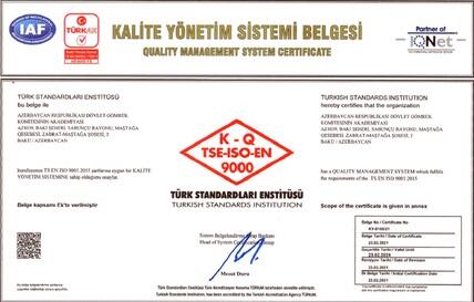 Türk Standartları İnstitutunun baş katibinin müşaviri, TS EN ISO 9001 - Keyfiyyəti İdarəetmə Sistemi üzrə baş auditor Arif Qani tərəfindən aparılan təlimləri uğurla başa vuran Akademiya əməkdaşlarına müvafiq sertifikatlar verilib.