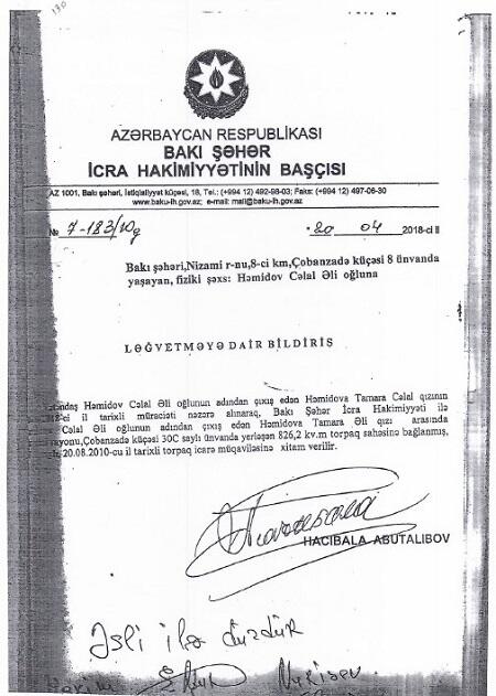 “Belə ki, Tamara Həmidovanın qardaşı Cəlal Əli oğlu ilə Həmidovla Bakı Şəhər İcra Hakimiyyəti arasında torpaq sahəsinin icarəyə verilməsinə dair 20 avqust 2010-cu il tarixli, 0912 saylı icarə müqaviləsi bağlanıb. İcarəyə verilən həmin torpaq bizim Çobanzadə küçəsi 45A ünvanında yerləşən torpaq sahəmizə bitişik ərazidə yerləşir. İcarəyə verilmiş torpaq sahəsinin dönmə nöqtələrini yerə köçürərkən aydın olur ki, icarə verilən torpağın bir hissəsi bizim torpaq sahəsini zəbt edir. Qalan hissəsi isə Bakı şəhərinin şərq hissəsini içməli su ilə təmin edən, diametri 1200-1400 mm olan yüksək təzyiqli magistral su kəmərlərinin sanitar mühafizə zonasına düşür. Həmin icarə müqaviləsi bizim maraqlarımıza toxunduğu üçün biz Bakı Şəhər İcra Hakimiyyətinə və Cəlal Həmidova verilən icarə müqaviləsinin və onun əsasında daşınmaz əmlakın dövlət reyestrində aparılmış qeydin ləğv edilməsi, C.Həmidovun həmin torpaq sahəsindən çıxarılmasına dair iddia ilə məhkəməyə müraciət etmişdik. Nizami Rayon Məhkəməsində ekspertiza rəyi və toplanmış başqa sübutlarla icarə müqaviləsinin əsasında bizə məxsus torpaq sahəsinin zəbt edilməsi tam təsdiq olundu. Məhkəmədə Tamara Həmidova və H.Abutalıbovun dəstəsi icarə müqaviləsinin ləğv edilməsinin və iş üzrə xüsusi qərardadın çıxarılmasının qaçılmaz olduğunu anladılar”.