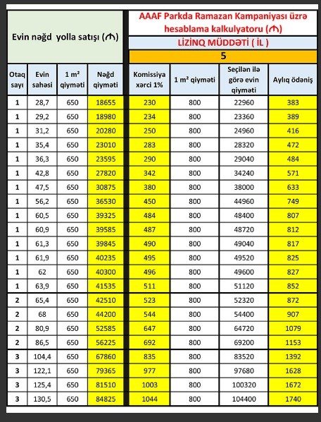 Məsələn: 28.7 m² olan 1 otaqlı mənzilin dəyəri 5 illik daxili ödəmə şərtləri ilə 22 960 manat müəyyən edilir və məbləğ 60 aya bölünür. Müqavilə imzalandığı zaman 1% rəsmiləşdirmə xərci – 230 manat, borc məbləği isə 60 aya bölünərək, ayda 383 manat müəyyənləşdirilir.