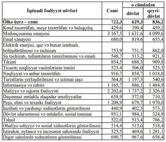 Dövlət Statistika Komitəsindən Axar.az-a verilən məlumata görə, müvafiq dövr ərzində dövlət müəssisələrində çalışan işçilərin orta aylıq nominal əmək haqqı 629,3 manat, özəl müəssisələrdə isə 836,2 manat olub.