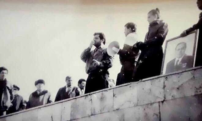 “Onlardan birinin fotosunu sizə təqdim edirəm. Fotoda söz verən gənc Sadiq Qurbanovdur, çıxış edən isə hamının tanıdığı mərhum general, Gəncənin sabiq polis rəisi olmuş Rasim Musayevdir”.