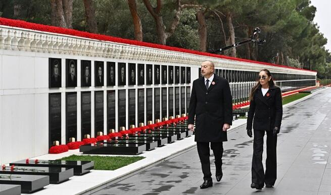 Axar.az xəbər verir ki, dövlətimizin başçısı İlham Əliyev və birinci xanım Mehriban Əliyeva ölkəmizin azadlığı uğrunda həlak olanların əziz xatirəsini ehtiramla yad ediblər.