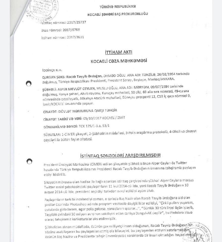 Bununla bağlı təqdim edilən sənədlərdən məlum olur ki, onun haqqında cinayət işi Türkiyə Respublikası Kocaeli Şəhər Baş Prokurorluğu tərəfindən 2017-ci ilin oktyabr ayında açılıb.
