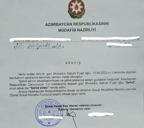 Uşaq evində böyüyən şəhidimiz Səbuhinin qardaşı Sənana Müdafiə Nazirliyi tərəfindən "Şəhid ailəsi" statusu üçün sənəd təqdim edilib.