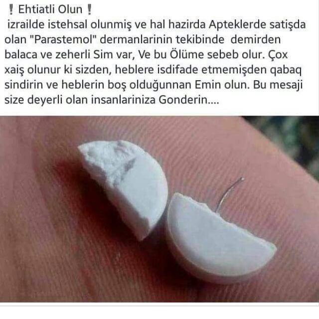 Yayılan məlumatda qeyd edilir: "İsraildə istehsal olunmuş və hal-hazırda satışda olan "Parastemol" dərmanlarının tərkibində dəmirdən nazik və zəhərli sim var. Bu isə ölümə səbəb olur. Çox xahiş edilir ki, həbləri istifadə etməmişdən öncə onu sındırın və həblərin simsiz olduğundan əmin olun".