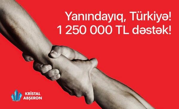 Davam edən axtarış və xilasetmə əməliyyatlarına Kristal Abşeron olaraq öz dəstəyimizi göstərmək adına T.C. İçişleri Bakanlığı Afet ve Acil Durum Yönetimi Başkanlığı - AFAD-a 600 000 TL ianə etdik və 650 000 TL dəyərində isə Türkiyədən qida məhsulları, Azərbaycandan isə bir sıra zəruri ləvazimatlar (çadır, yataq dəstləri və çarpayı, masa, oturacaq, qızdırıcı və s.) alaraq zəlzələ bölgəsinə göndəririk.