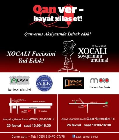 LAYF Xeyriyyə İctimai Birliyi bu il Xocalı faciəsinin qurbanlarının xatirəsini qanvermə aksiyaları keçirməklə yad edəcək.