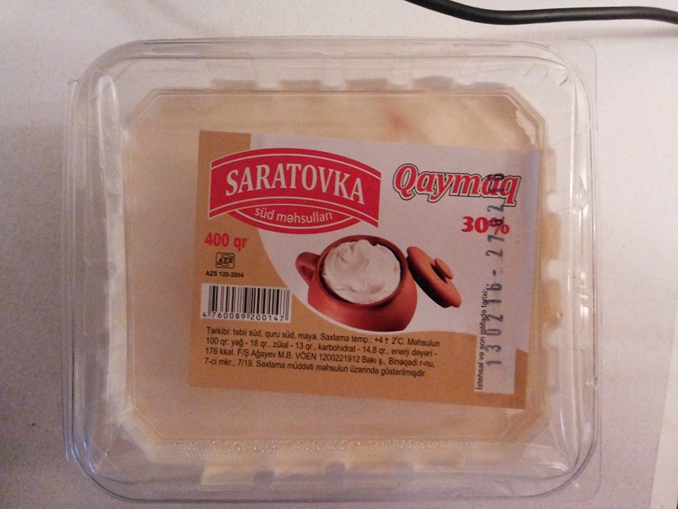 Axar.az-ın məlumatına görə, İlkin Həsənov adlı Feysbuk istifadəçisi "Favorit" marketdən Saratovka süd məhsullarının istehsal etdiyi qaymaqdan aldığını yazıb.
