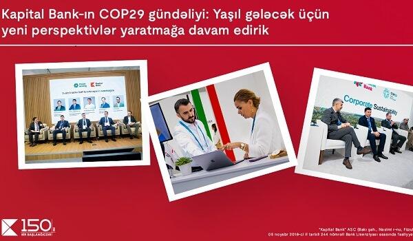 İqlim dəyişikliyi ilə mübarizə məqsədi daşıyan, dünya liderləri, alim və mütəxəssisləri bir araya gətirən ən vacib qlobal tədbirlərdən biri, BMT-nin İqlim Dəyişikliyi üzrə Konfransı COP29 uğurla davam edir. Ölkənin birinci bankı Kapital Bank konfransda Paşa Holding nümayəndə heyətinin tərkibində iştirak edir. Tədbirin Yaşıl zona hissəsində Kapital Bank-a məxsus stend qurulub. Stenddə bankın rəsmi nümayəndələri iştirakçılarla fikir mübadiləsi aparır, təcrübələrini bölüşür, qonaqların suallarını cavablandırırlar.