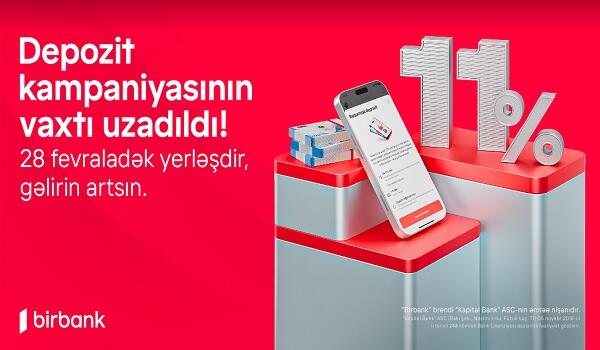 Birbankdan sərfəli depozit kampaniyası davam edir. Belə ki, 28 fevral 2025-ci il tarixinədək Birbank-da manat valyutasında depozit yerləşdirən hər kəs 6 aylıq müddətə illik 11%-dək gəlir əldə edir.