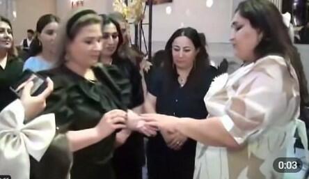 Görüntülərdə bir neçə qadının sıraya düzüldüyü, onlardan birinin müəllimənin barmağına qızıl üzük taxdığı əks olunub.